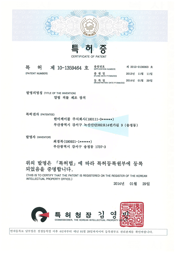 인증서 (특허증) 말림 직물 제조 장치 페이지 정보 작성자 hanmicable 댓글 0건 조회 9회 작성일 25-11-26 14:39 목록 답변 본문 (특허증) 말림 직물 제조 장치 이전글(특허증) 말림 직물 제조 장치 25.11.26 다음글(특허증) 열수축 튜브 제조장치 25.11.26